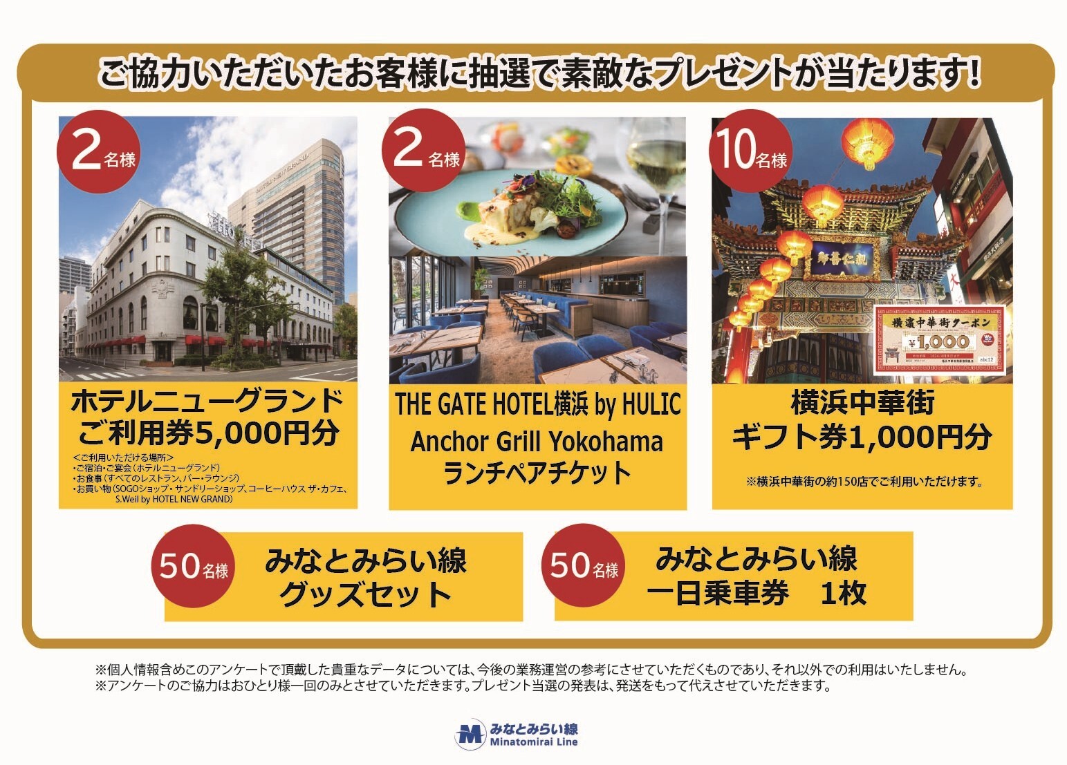 お知らせ 戻る 2025/12/18 「みなとみらい線お客様満足度調査」の実施について(終了しました) 横浜高速鉄道では、みなとみらい線をご利用いただいているお客様からご意見やご感想をお伺いし、今後のサービス向上に活かしていくことを目的としたお客様満足度調査を今年度も実施いたします。 尚、ご回答いただいた皆様には抽選で、沿線の施設等でご利用いただける素敵なプレゼントをご用意しております。 皆様のご回答をお待ちしております。 ~本調査は終了いたしました。沢山のご回答ありがとうございました。~